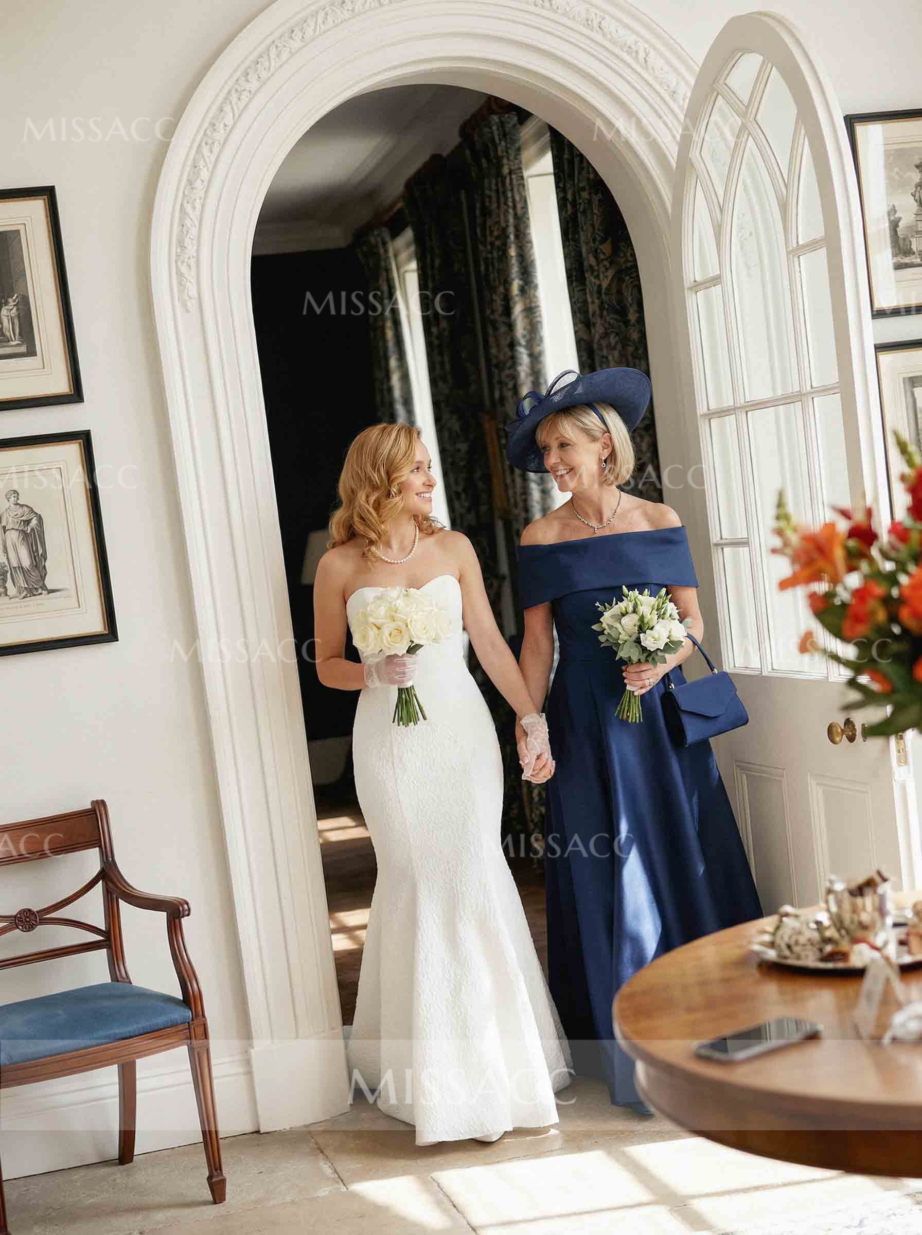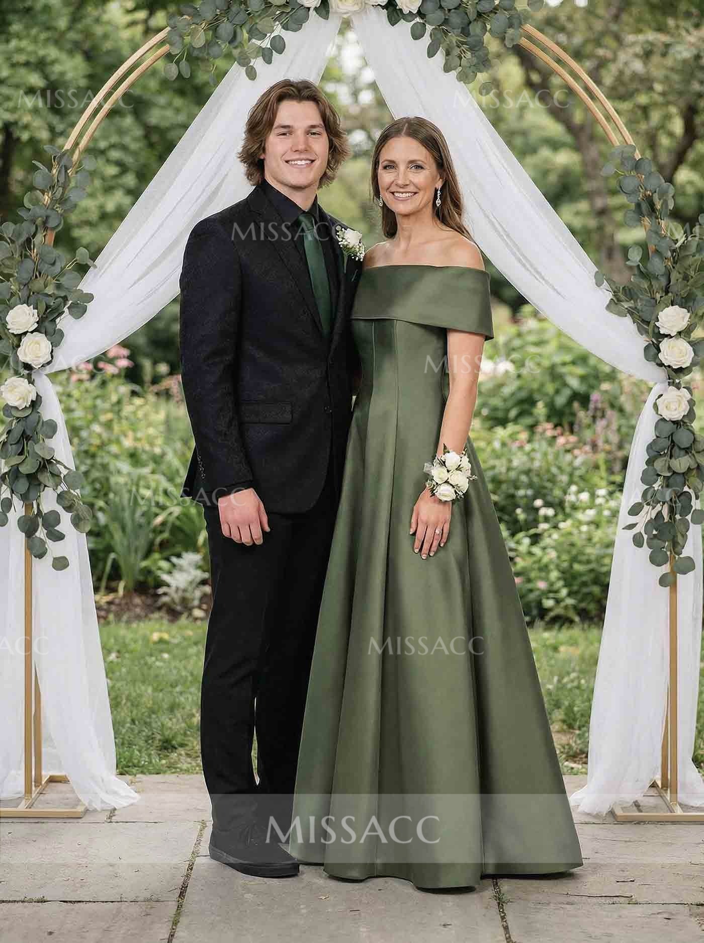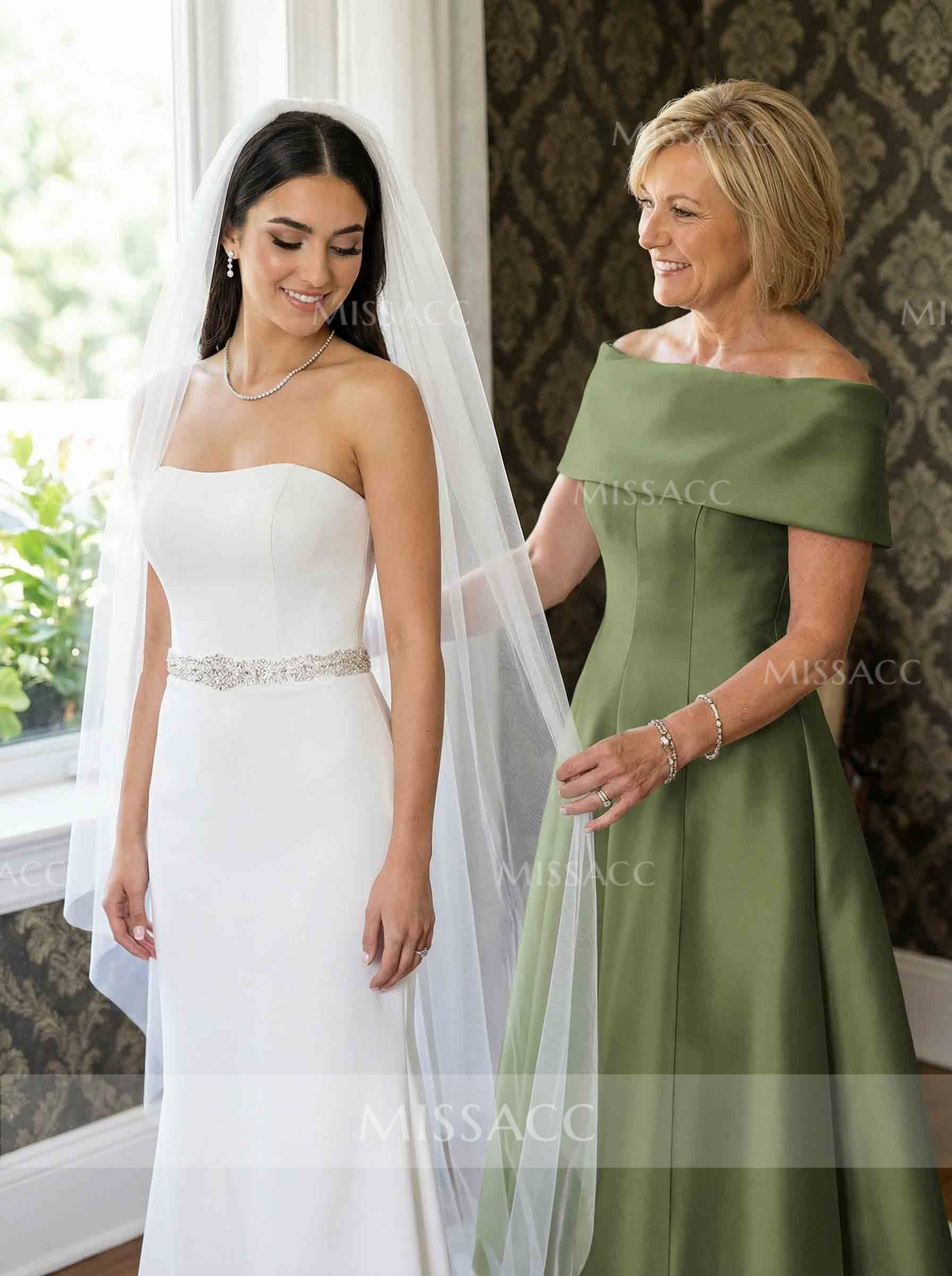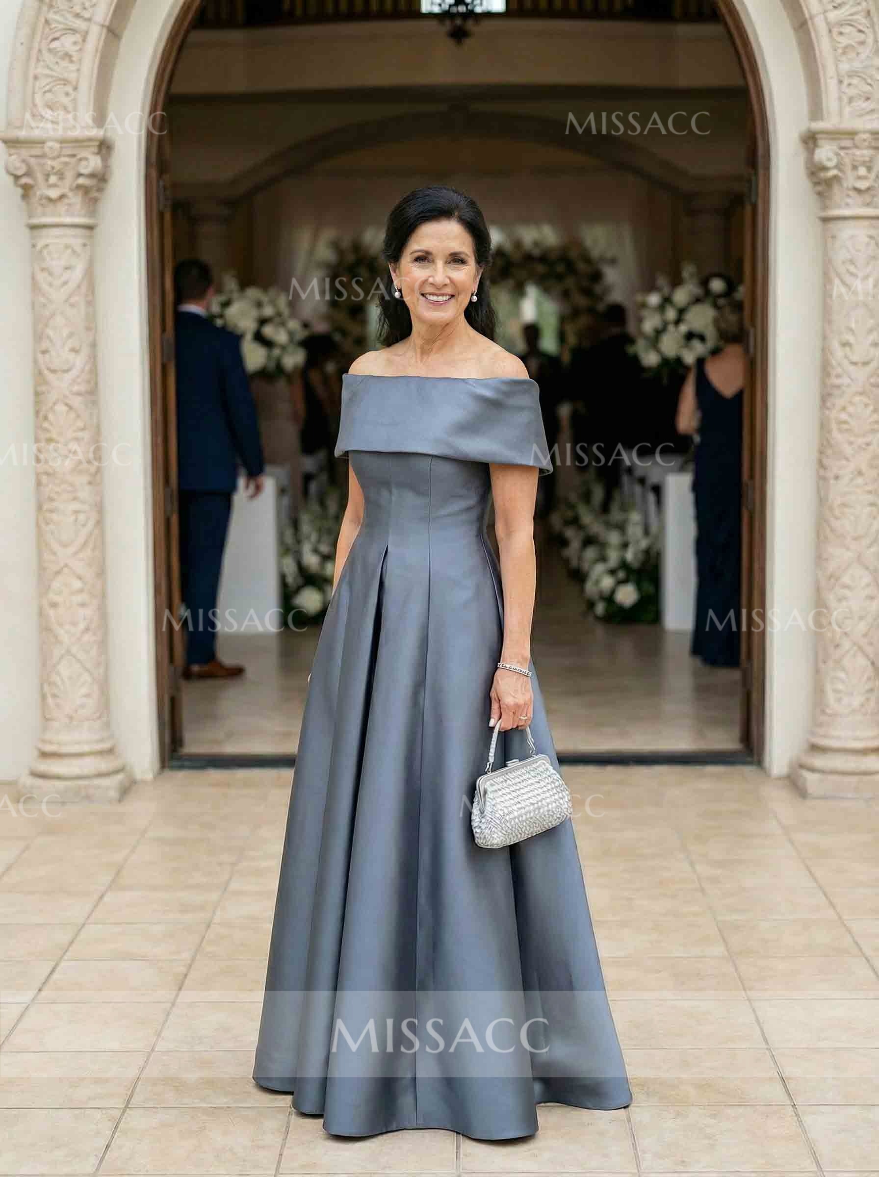 Elegant A-Line Off-the-Shoulder Mother of the Bride Dress, crafted in premium fabric for a floor-length, sleeveless design. Perfect for weddings and special occasions, showcasing timeless sophistication.