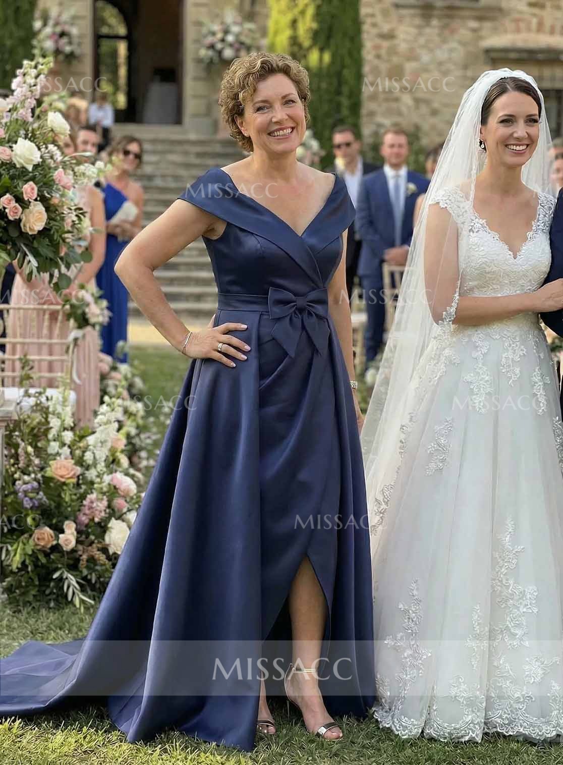 Stylish A-line satin lace mother of the bride dress with 3/4 sleeves and a sweeping train, perfect for weddings and formal events.
