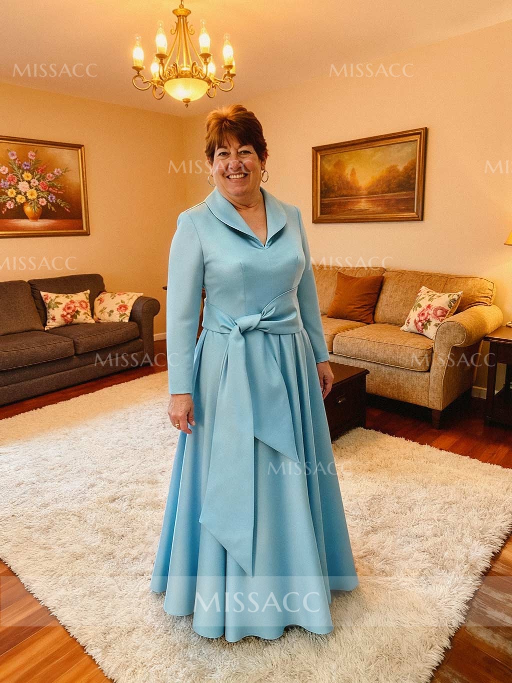 Elegant A-Line V-Neck Long Sleeves Floor-Length Satin Mother of the Bride Dress, crafted for special occasions, featuring a flattering silhouette and luxurious satin fabric.