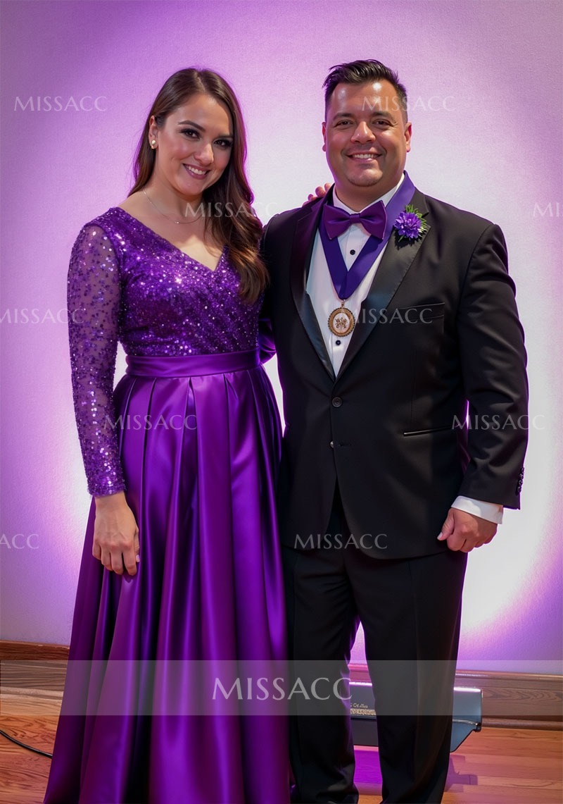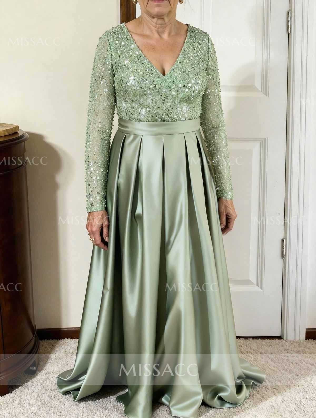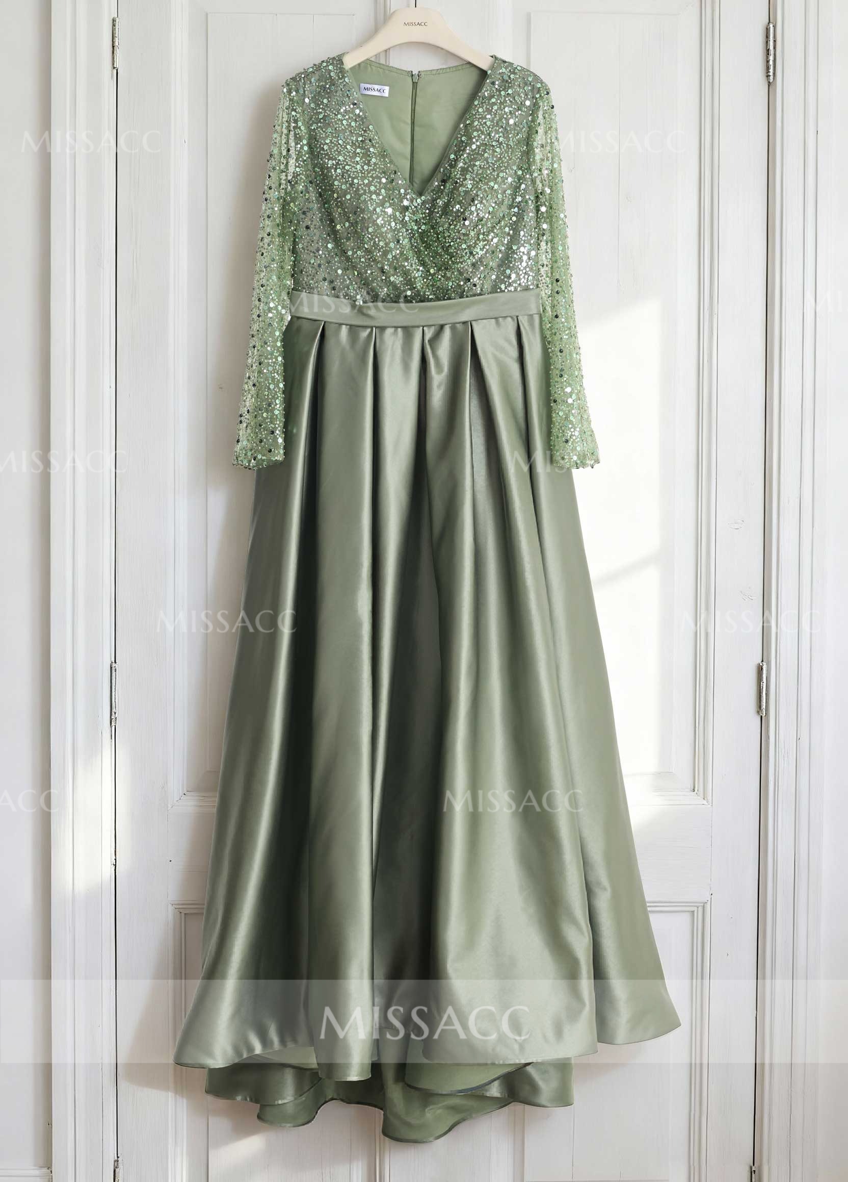 Discover our A-line V-neck Satin Sequined Evening Dress, featuring a flattering pleated design for a sophisticated look perfect for special occasions. Luxurious satin material with sequin accents for a touch of glamour.
