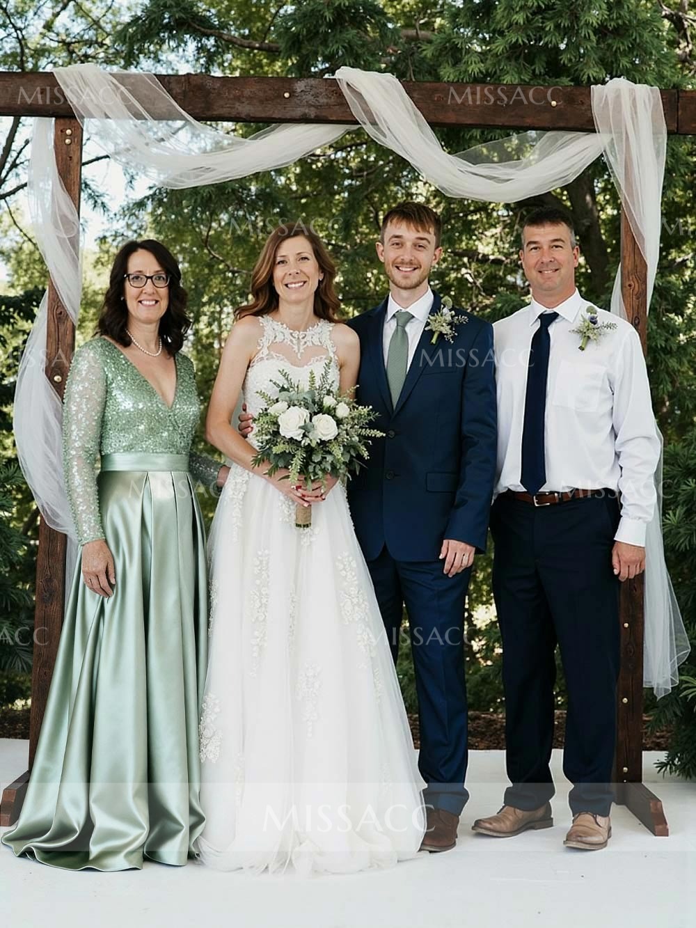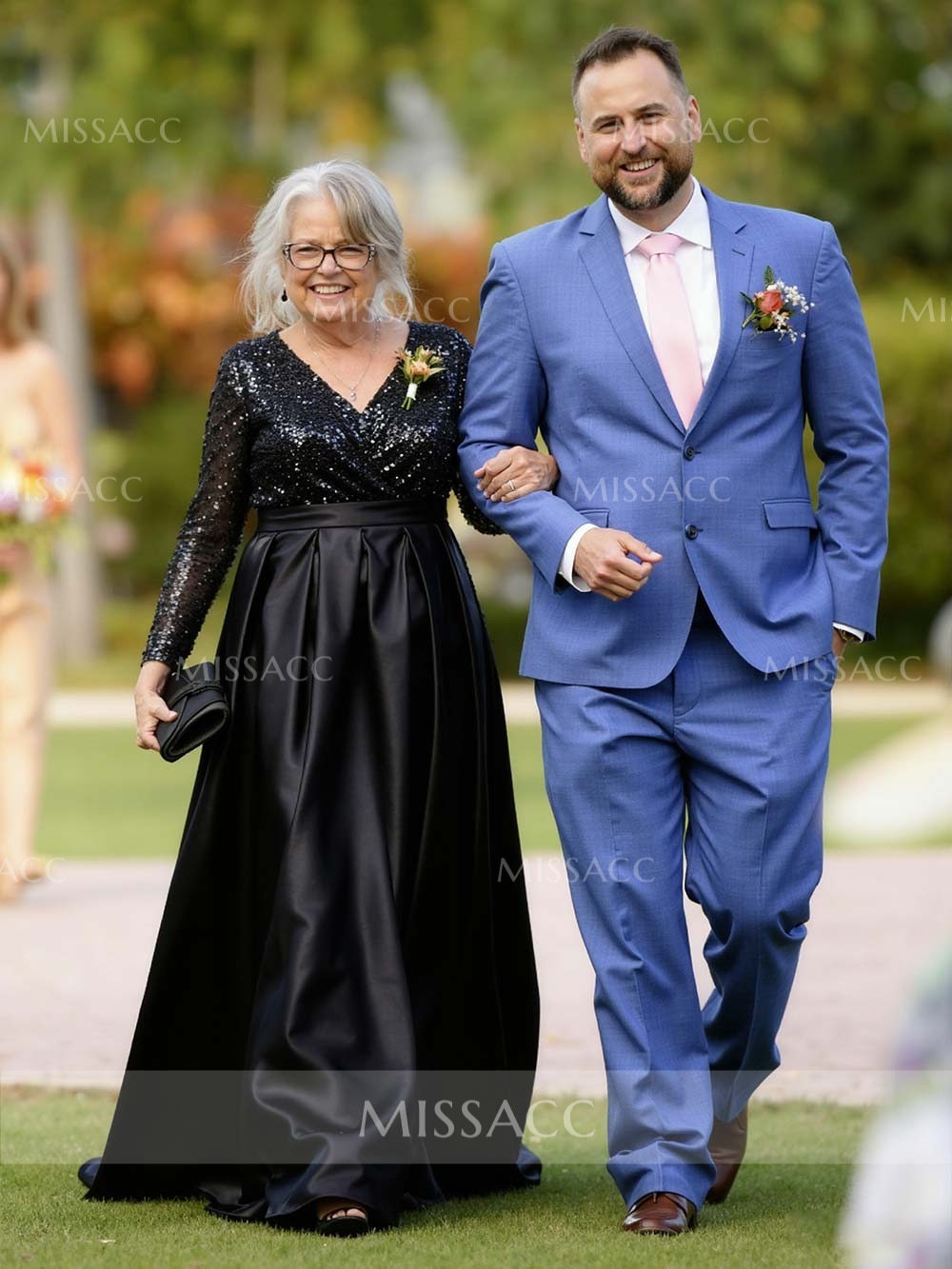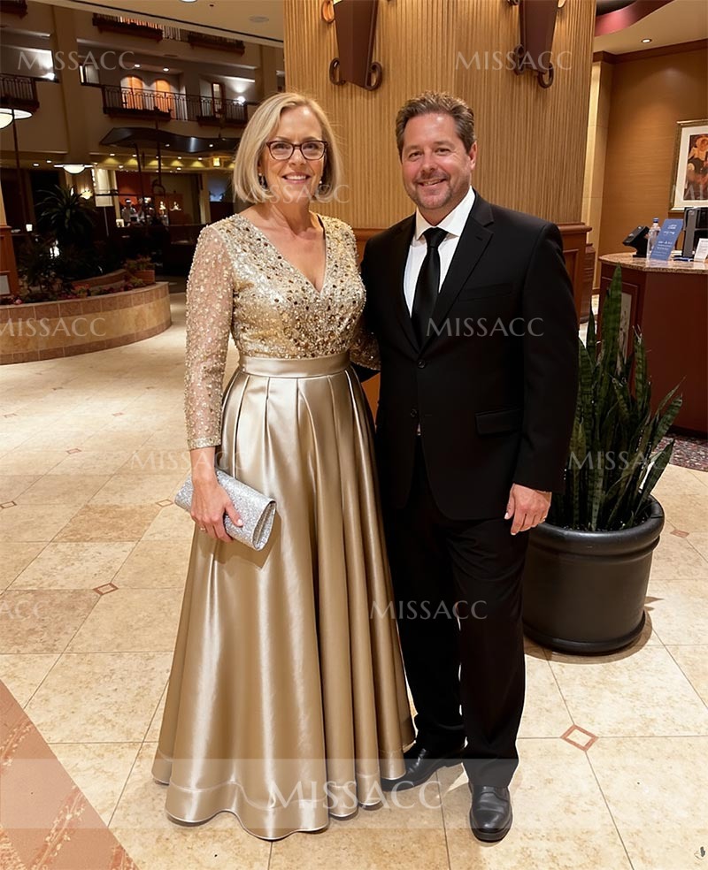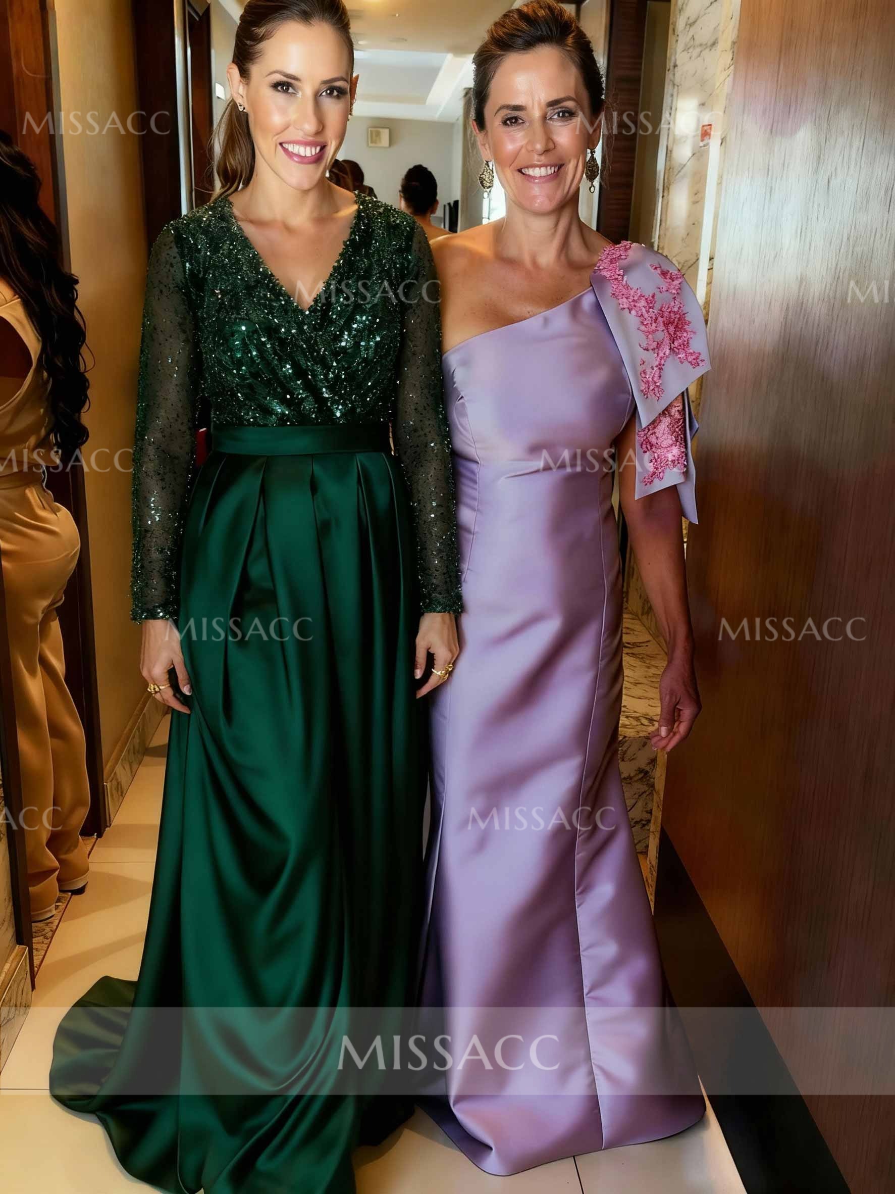 Discover our A-line V-neck Satin Sequined Evening Dress, featuring a flattering pleated design for a sophisticated look perfect for special occasions. Luxurious satin material with sequin accents for a touch of glamour.