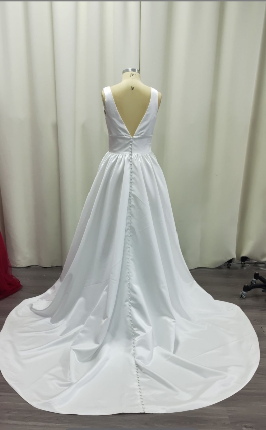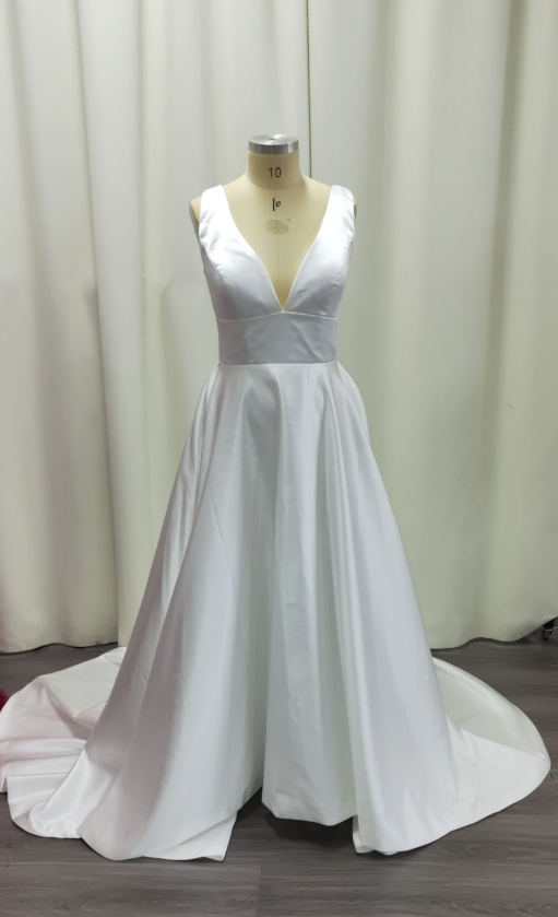 Stunning A-line V-neck satin wedding dress with pockets, featuring a chapel train for a regal look. Perfect for your special day.