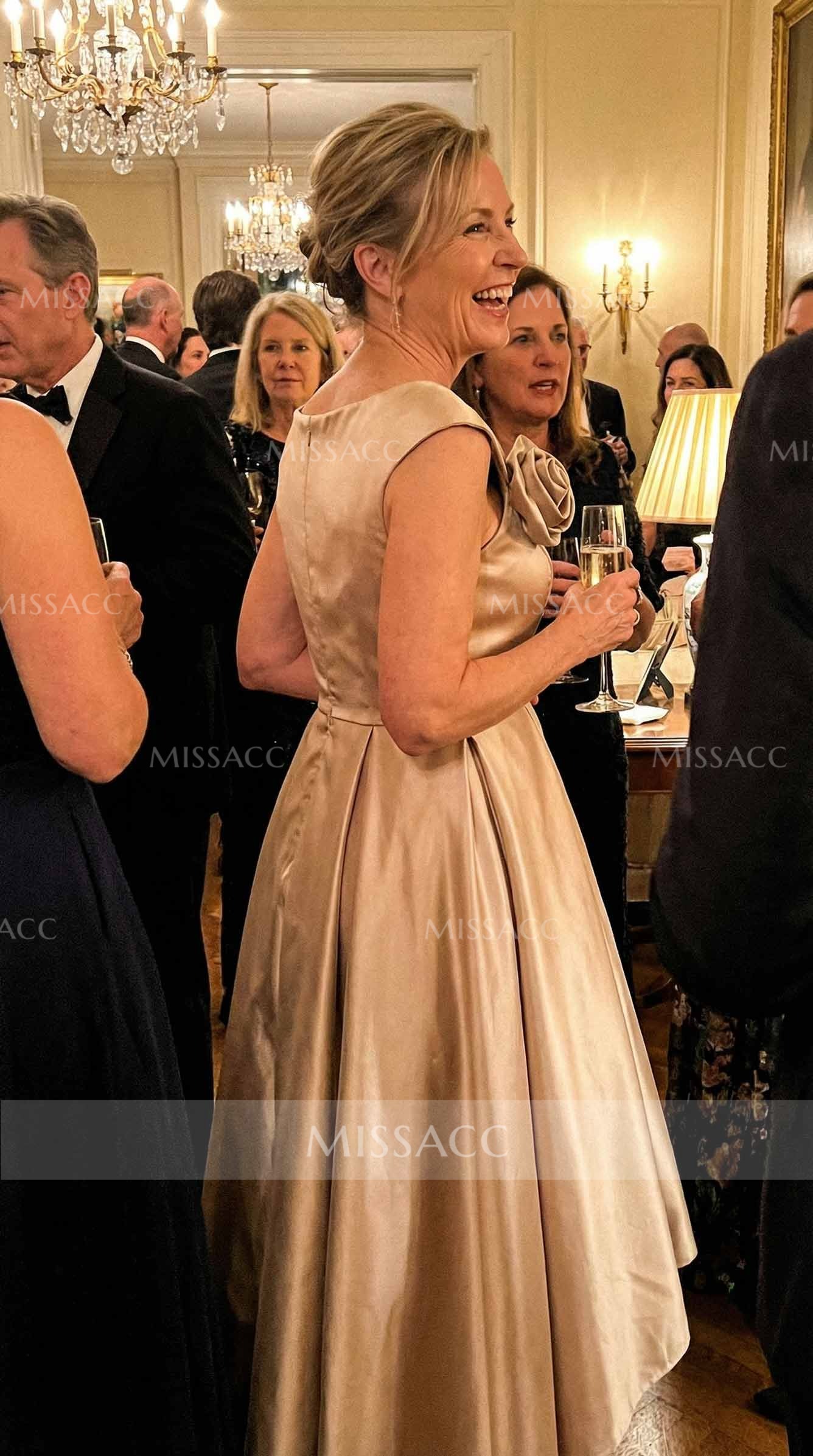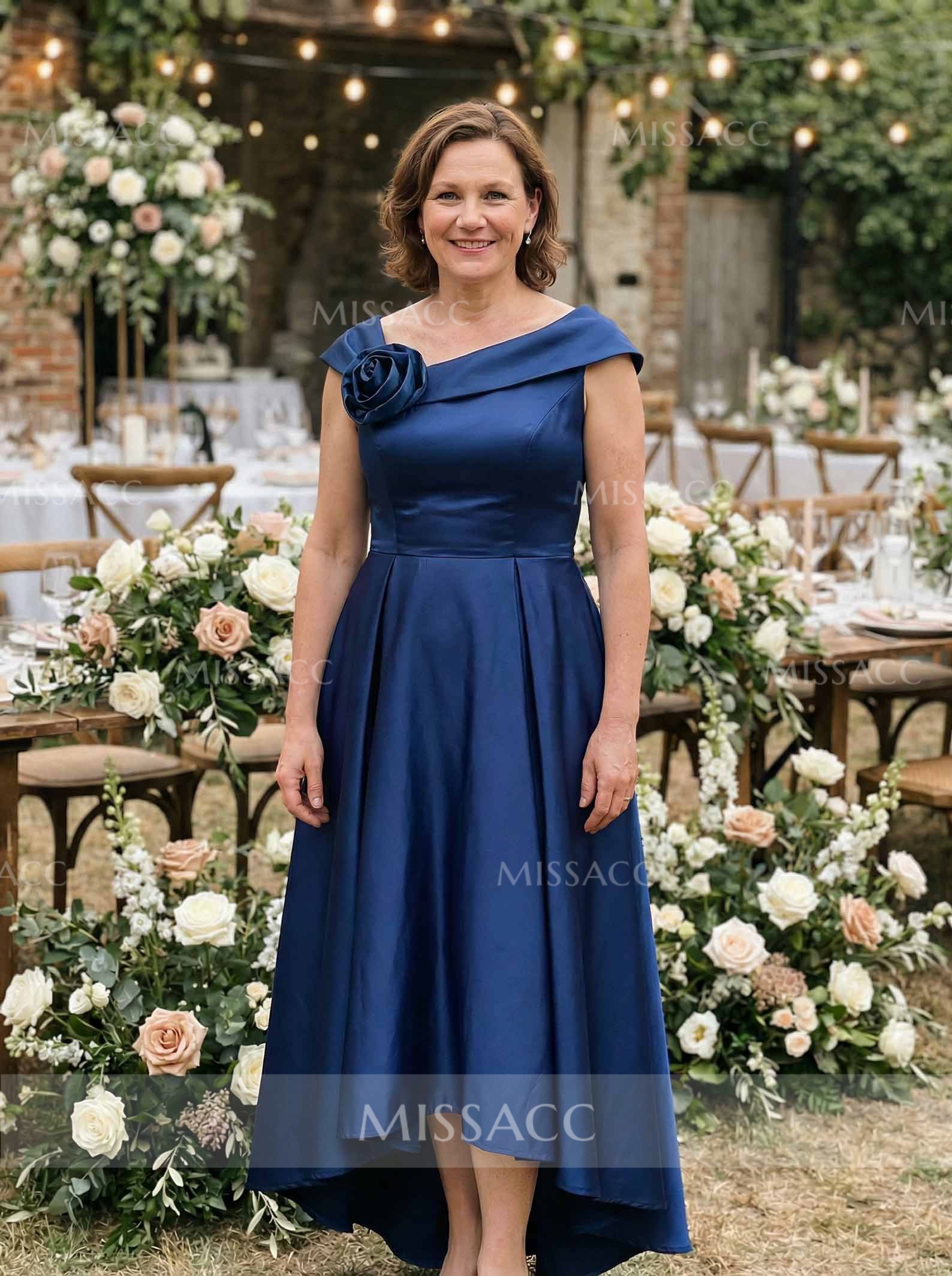 This A-line mother-of-the-bride gown is crafted from premium satin and features a unique asymmetrical hem. The sleeveless style is paired with exquisite three-dimensional flower decorations, showing modern and fashionable charm. Not only suitable for formal wedding celebrations, but also as a dinner dress. The smooth cut ensures a comfortable fit, making it ideal for important occasions.