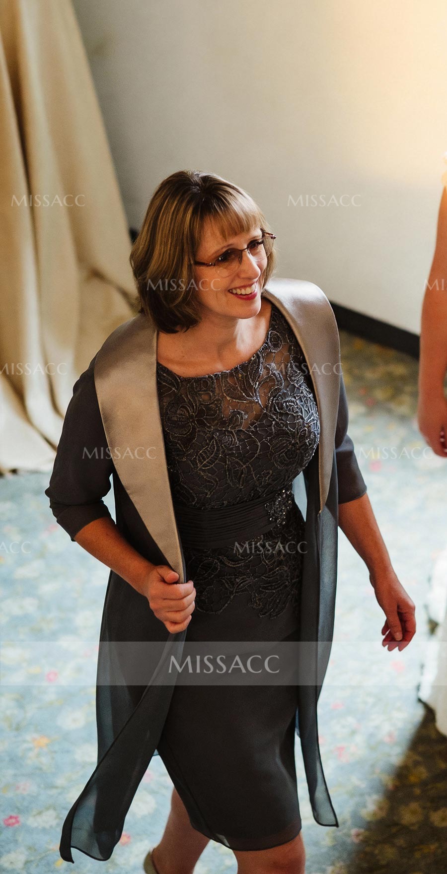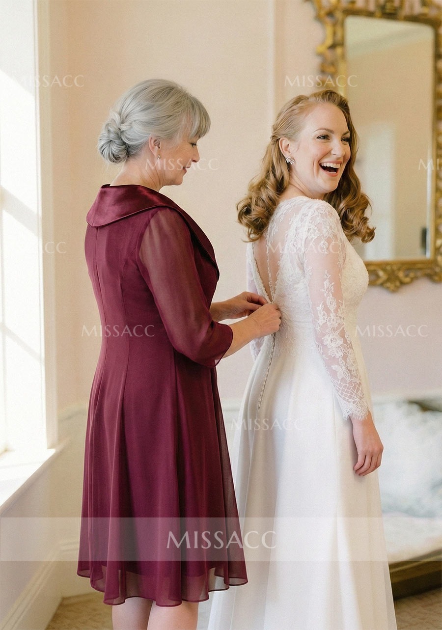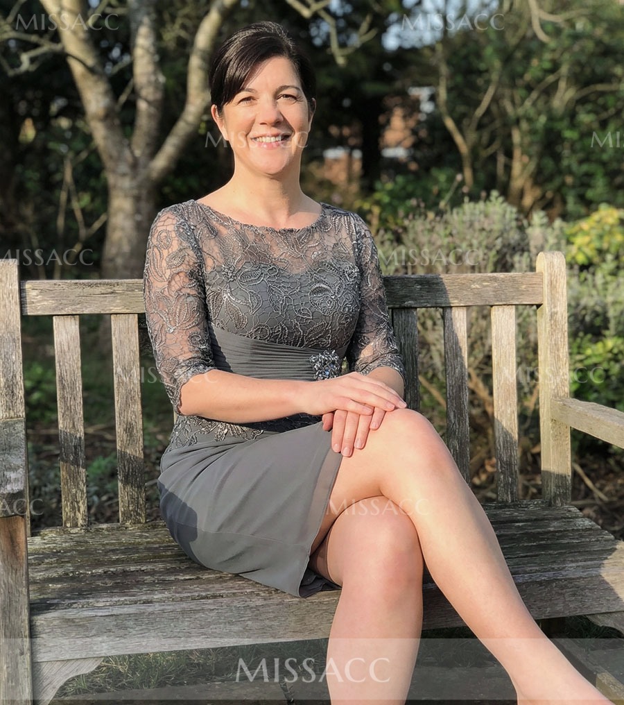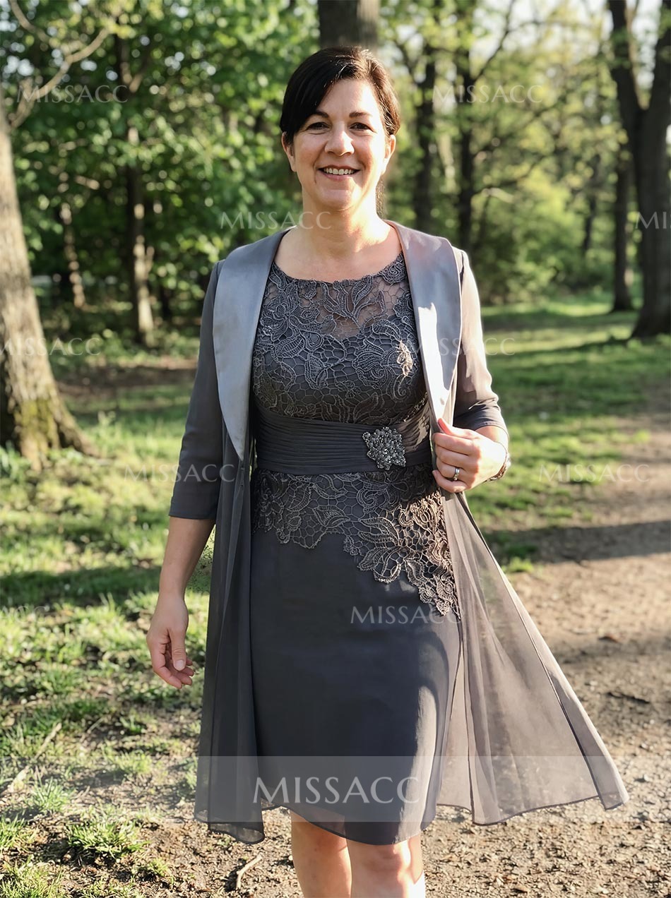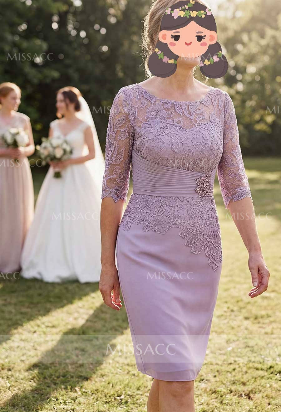 Introducing our stunning mother of the bride dress, crafted from delicate lace and flowing chiffon. This sheath column silhouette features a flattering scoop neckline and elegant half sleeves, reaching a graceful knee length. Perfect for weddings and formal events, it offers timeless sophistication. Shop sophisticated wedding guest attire.
