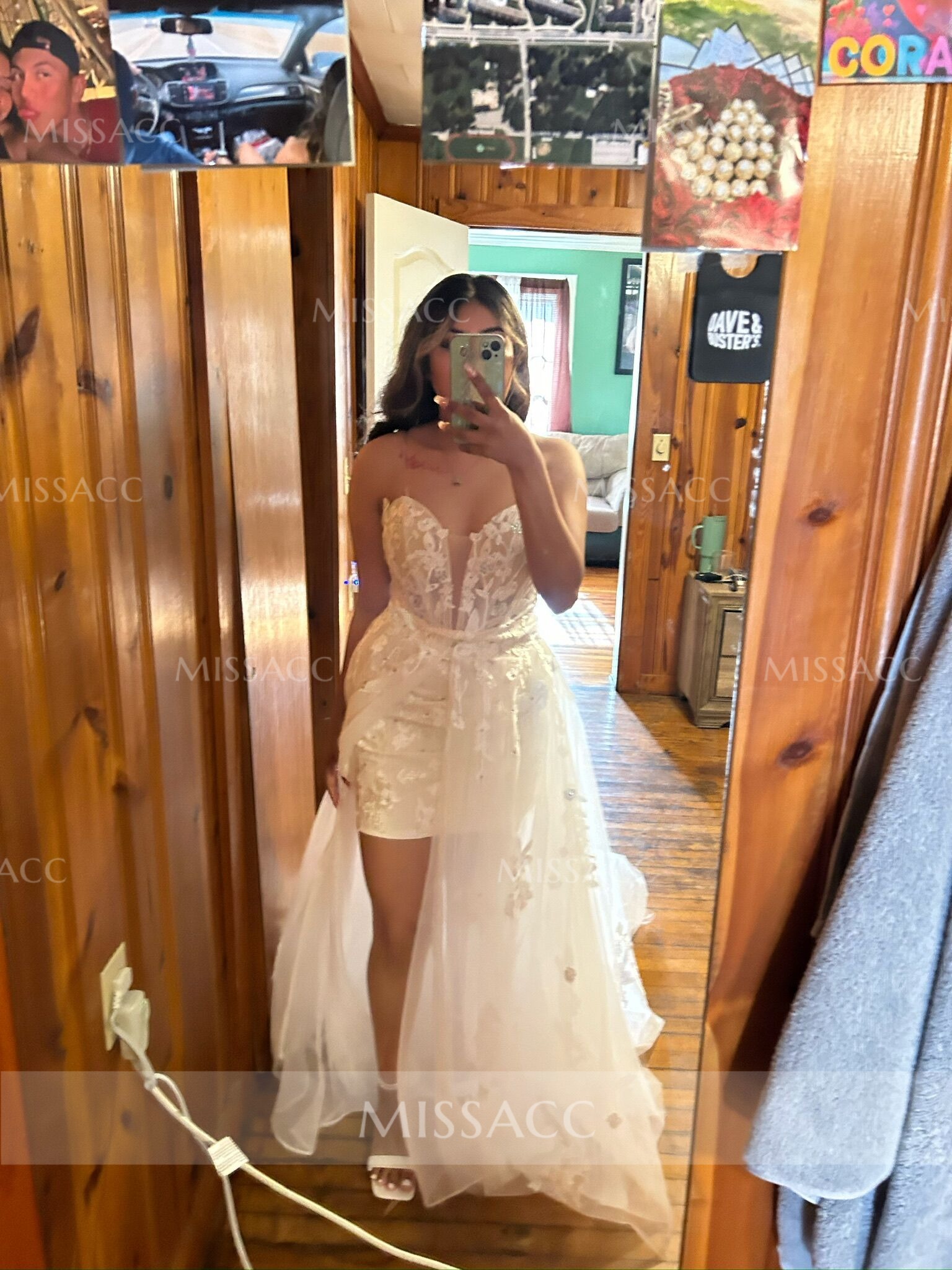 Jumpsuit/Pantsuit Sweetheart Long Sleeves Sweep Train Chiffon/Lace/Elastic Satin Bride Wedding Dress With Appliques Lace