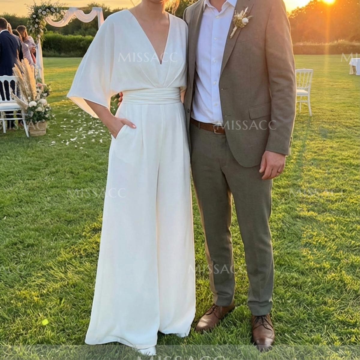 Elegant Jumpsuit Pant Suit with a V-neck and 1/2 sleeves, perfect for a sophisticated wedding look. Floor-length design adds a touch of grace to any special occasion.