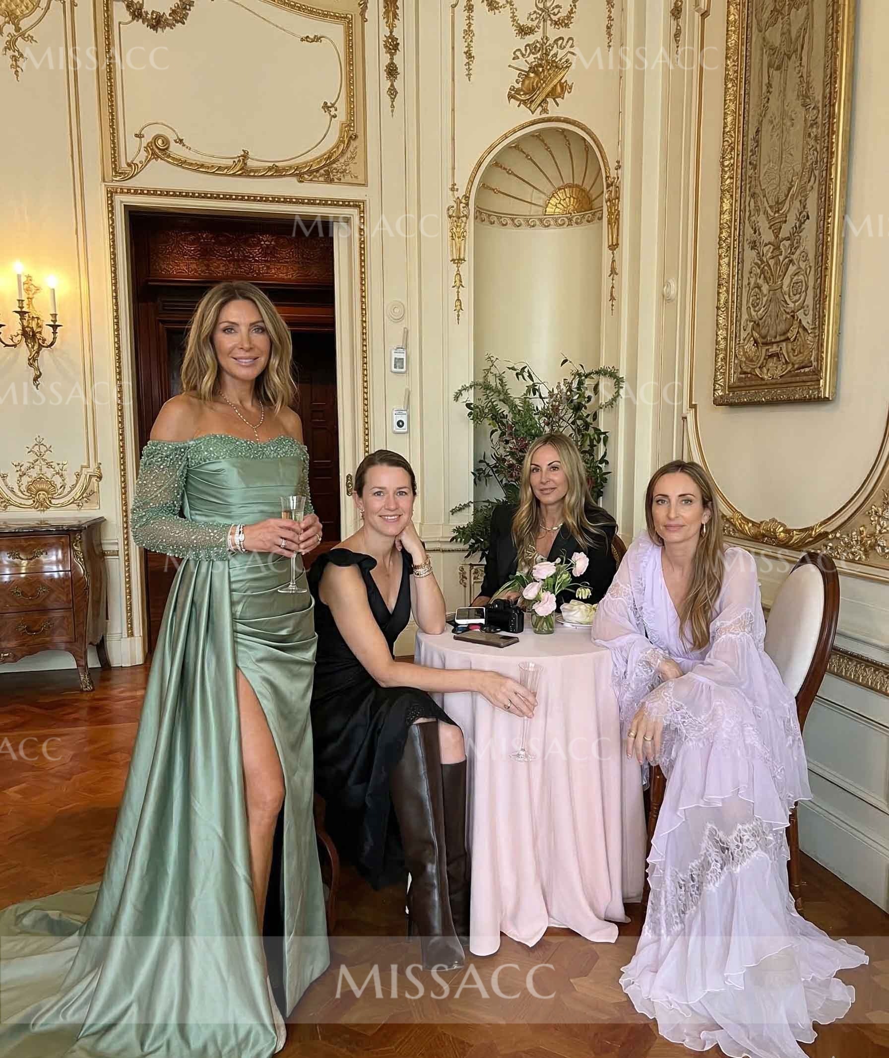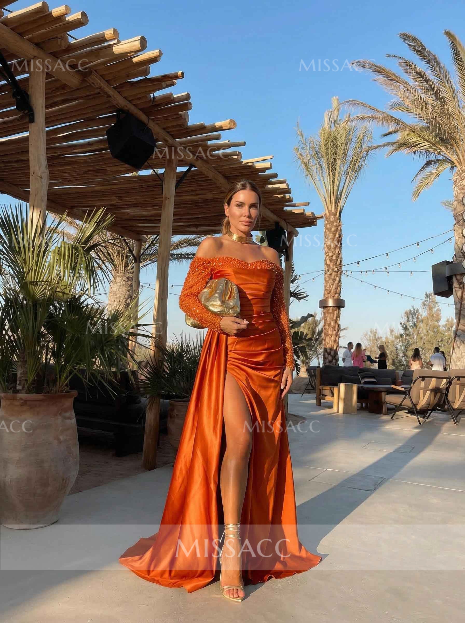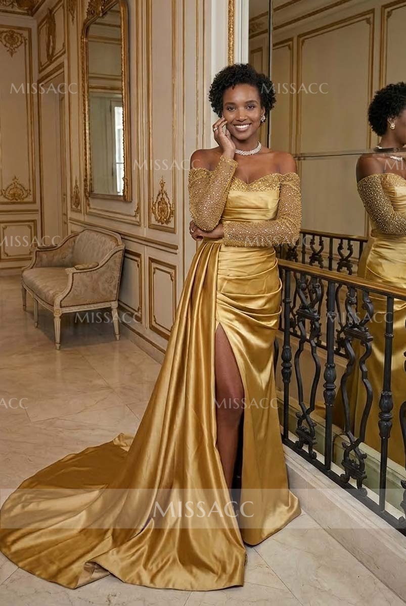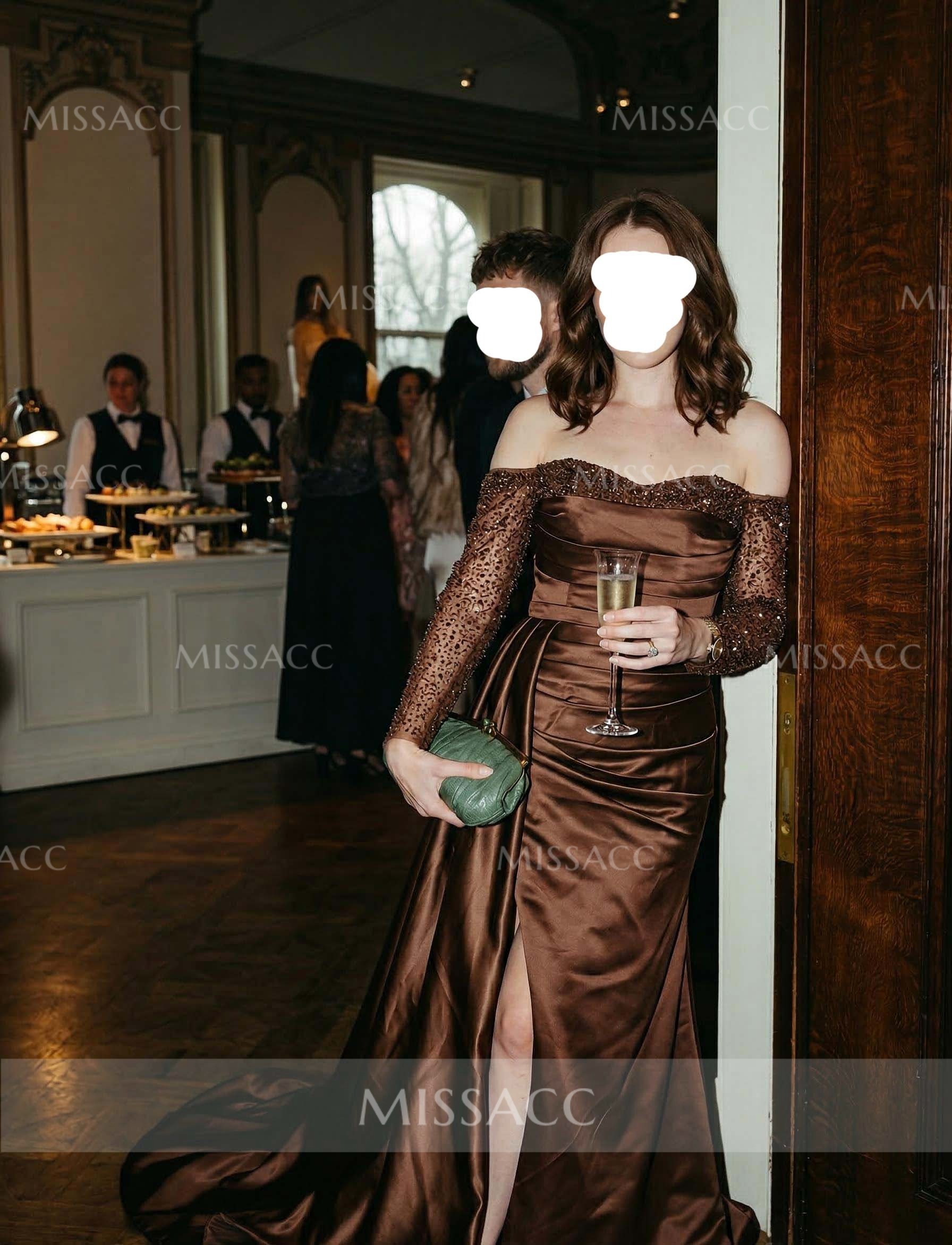 "Stunning satin sheath dress with off-shoulder sleeves and a chic split-front design. Perfect for evening events, this dress features dazzling rhinestone accents for a glamorous look."