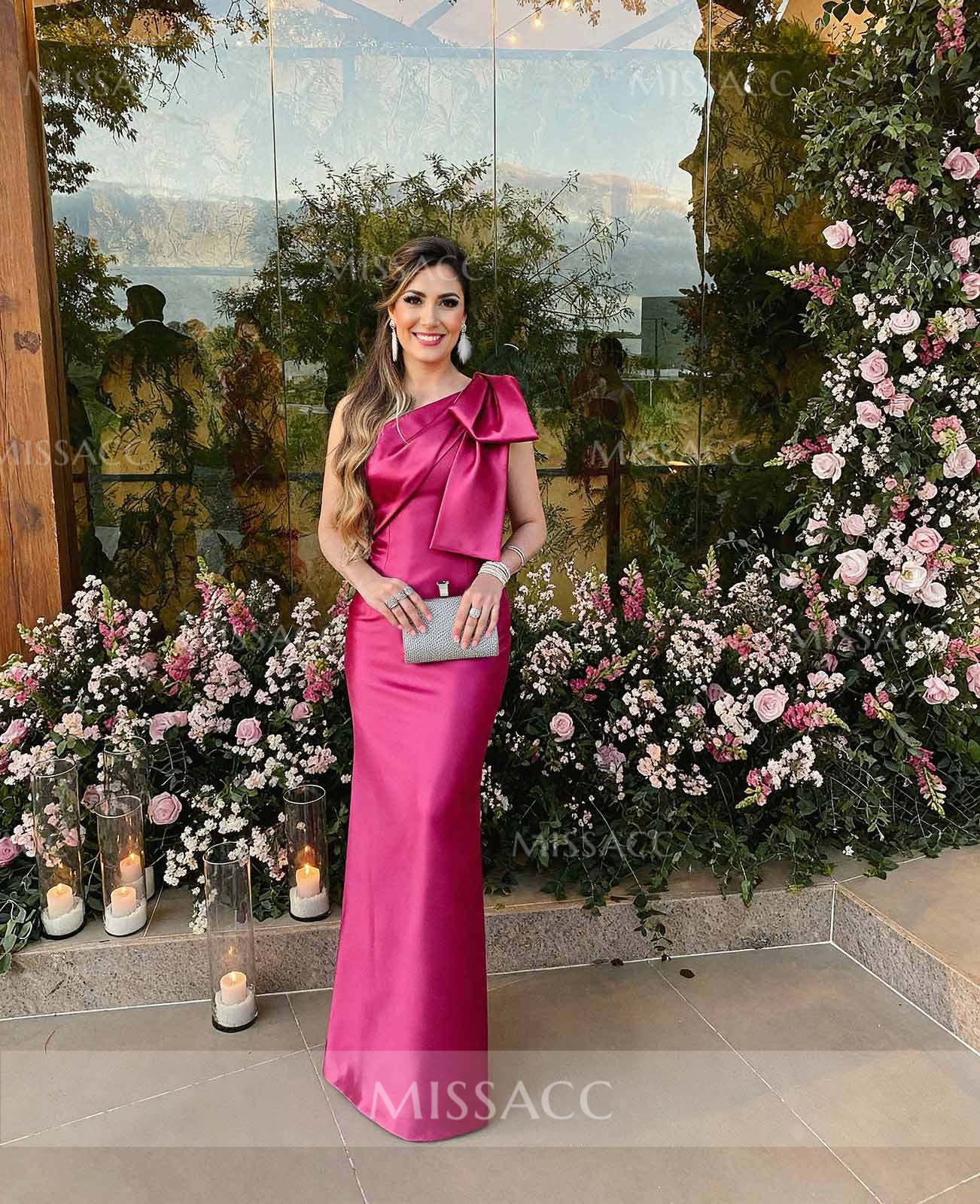 Look jaw-dropping as you walk into the special event in this spectacular dress.Wonderfully sculpted from satin fabric, this classy piece flaunts an asymmetrical neckline and a one-sleeve bodice along the oversized bow accent.The smooth full-length sheath skirt features a back slit for more leg movement. Be a showstopper for special occasions and weddings