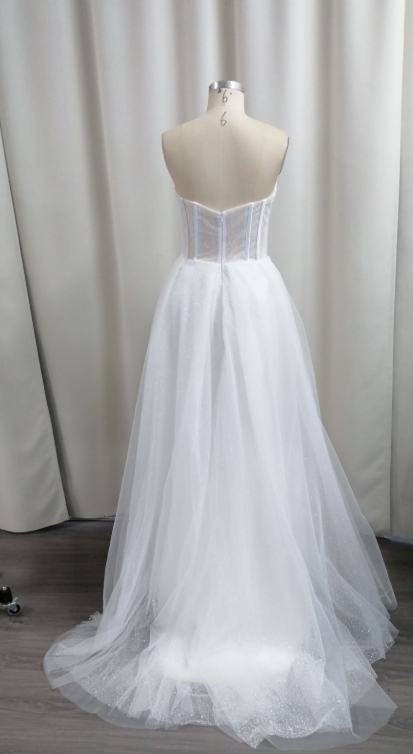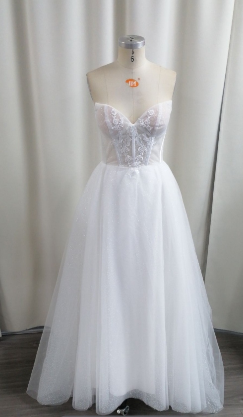The sparkling sequin sweetheart lace A-line wedding dress is the perfect choice for your special day. This exquisite gown features a sweetheart neckline that accentuates the collarbone, and sequin lace adds a touch of glamor and sophistication.The A-line silhouette flatters a variety of body types and creates an air of grace and elegance, perfect for a wedding ceremony.