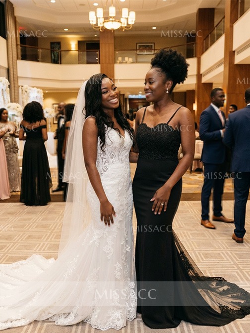 "Stunning satin bridesmaid dresses with a trumpet mermaid silhouette and lace appliques, perfect for weddings and special events."