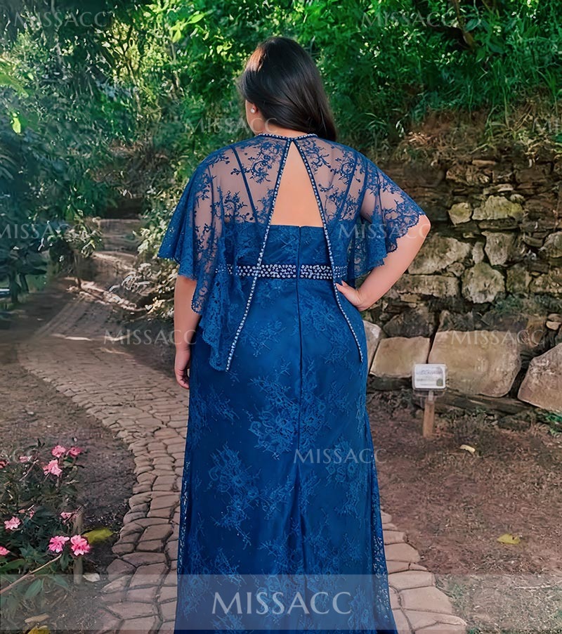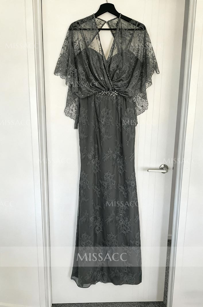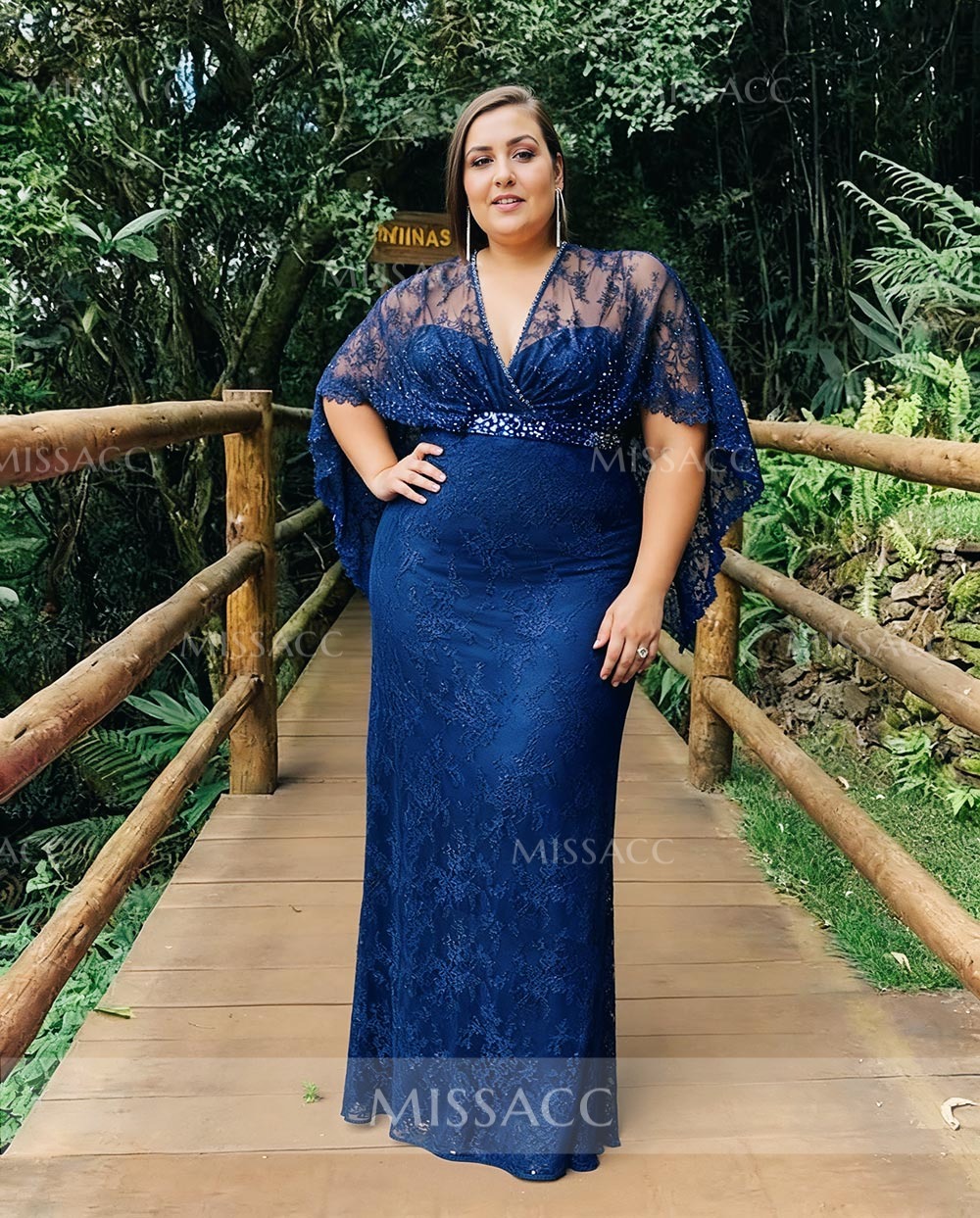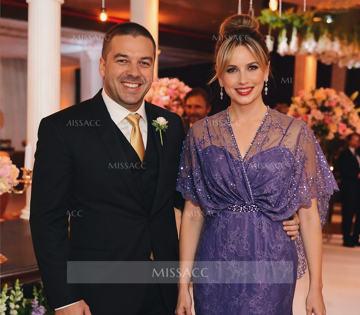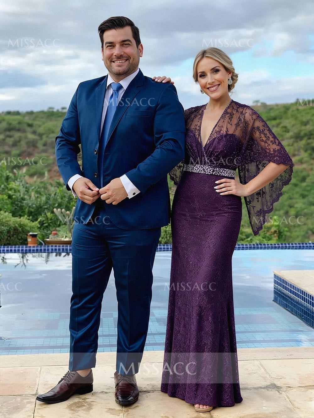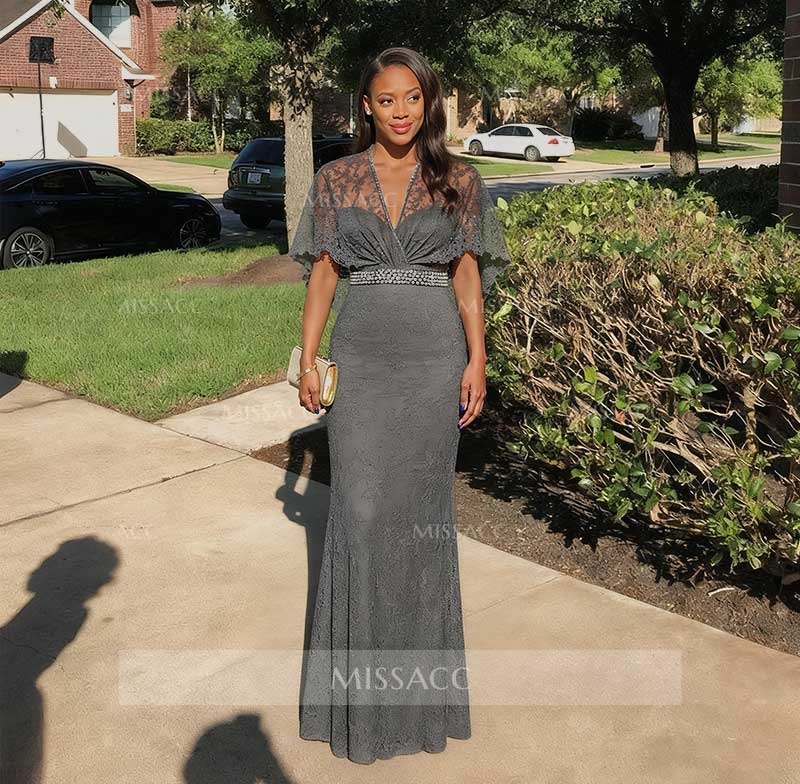 Stunning mermaid lace mother of the bride dress, featuring a v-neck and short sleeves, perfect for a chic wedding celebration.